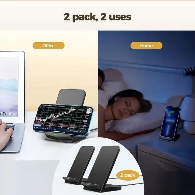 , Now you can experience fast wireless charging day and night with one 15W wireless charging stand at work and another at home, since it comes with 2 packs, which will be more convenient for you to use one for work and one for home, or one for you and one for your wife/husband. Great combination for meeting the needs of home and office.
