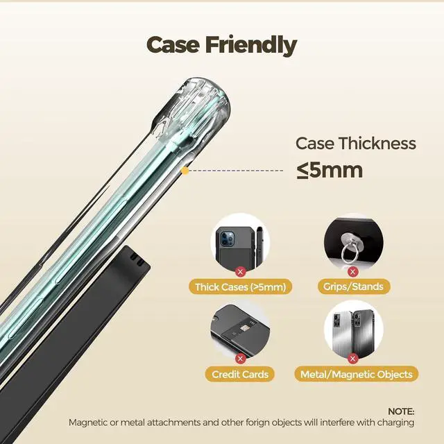The two-coil design offers a wider charging area than a typical round wireless charging pad while eliminating the hassle of finding the 'sweet spot', this wireless phone charger can charge your phone in any direction, vertically or horizontally at the perfect angle for eyes, so you can send messages, listen to music or make phone calls when charging. It can charge your phone without removing the case, but thick case (over 4mm) is not recommended.