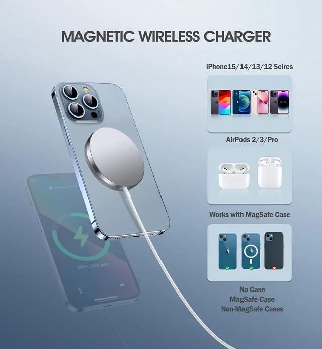 Specifically for iPhone 15/14/13/12 SeriesThe 2-pack Mag-Safe wireless charger makes wireless charging a breeze with its new upgraded magnetic technology. Up to 15W secure mag. safe wireless charging pads are perfectly compatible with iPhone 15, iPhone 15 Plus, iPhone 15Pro, iPhone 15 Pro Max, iPhone 14, iPhone 14 Pro, iPhone 14 Plus, iPhone 14 Pro Max, iPhone 13, 13 Pro, 13 Pro Max, 13 minis; iPhone 12, 12 Pro, 12 Pro Max, 12 minis, as well as AirPods Pro /3 and 2 models.