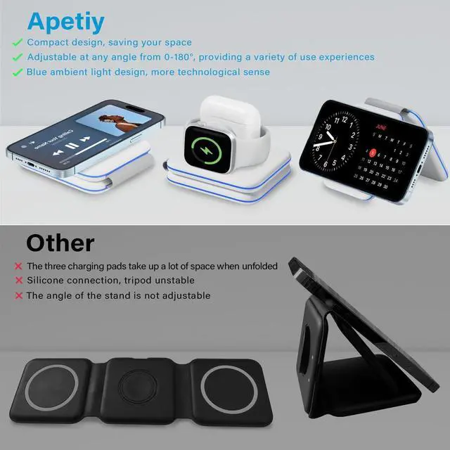 Portable & Foldable Travel Charger StationOur travel charger can be 180 ° folded, quickly transforming into a phone stand, perfect for traveling. The charging plate is equipped with a magnetic suction device that securely holds your phone in place, preventing slipping even when shaken. You can place your phone horizontally to watch movies, vertically to chat, and can be used in the office, and bedroom. It can also be folded into a wireless charging pad, charging while using.