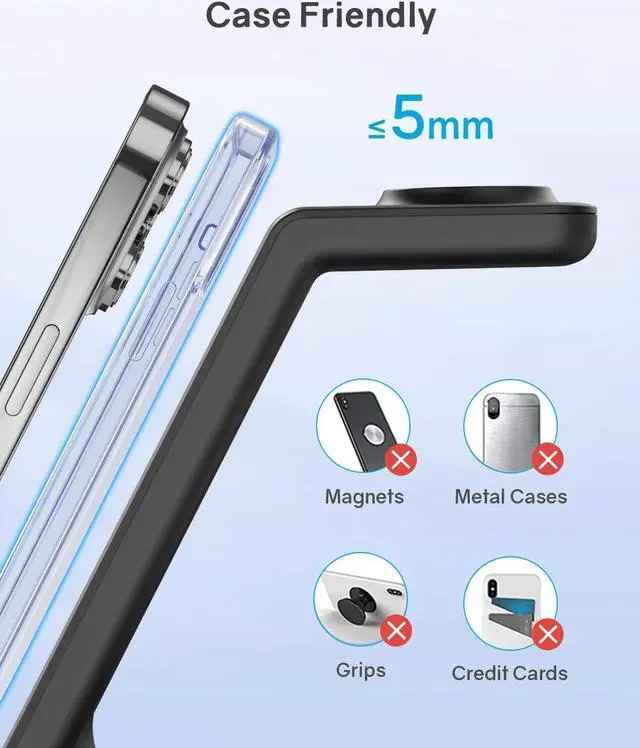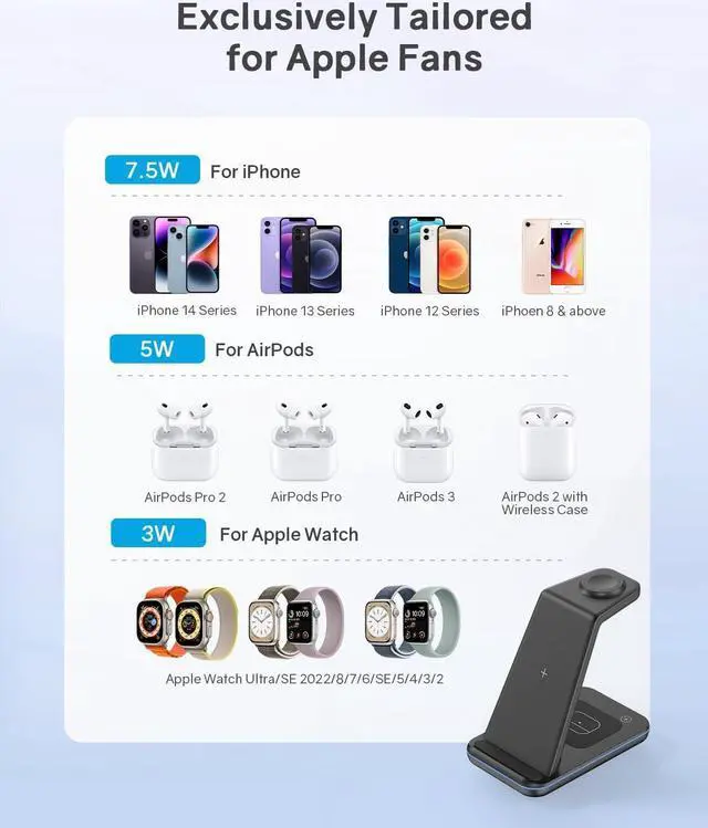 Universal Compatibility: 10W Max Fast Charging for Samsung Galaxy S22+/S22/21/ S20/S10/S10 Plus, etc. 7.5W Max Fast Charging for iPhone 15/14/14 Plus/14 Pro/14 Pro Max/13 Pro Max/13Pro/13/12 Pro Max/12 Pro/12/11/ 11 pro/11 Pro Max/XS XS Max/XR/X/8/8 Plus. Not for iPhone 12 Mini/13 Mini5W Max Standard Charging for Apple Airpods 3/2/Pro. 3W Max Standard Charging for Apple Watch 8/SE 2/7/6/SE/5/4/3/2. (Please upgrade your watch to WatchOS 8.6 )