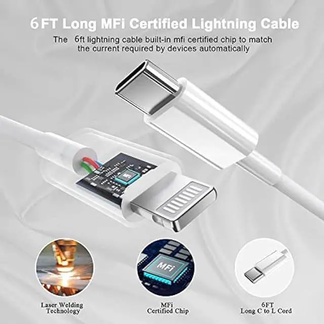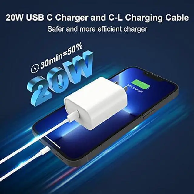 iPhone 15 14 Charger Fast Charging Equipped with a USB C port, PD 3.0 20W USB-C fast charger with 6ft type c to lightning cable provides Max 20W output power. This 20W USB-C iPhone chargers charge your new iPhone 15 14 13 12 up to 50% in just 30 minutes, 3X fast then 5W charger which saves more than 1 hour for you.