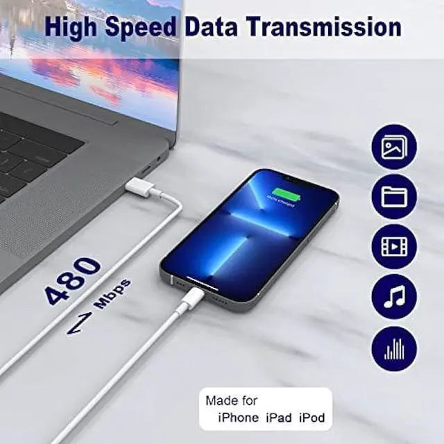 Apple MFi Certified Lightning Cables With the MFI Certified Chip, the 3 pack 6ft USB-C to lightning cord equips automatic chip recognition function. ensures flawless compatibility with iPhone devices. No more trigger warning messages. You will perfectly connect your iPhone/iPad, enjoy the 480 Mbps data transfer speed and Max 20w output power.