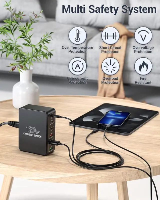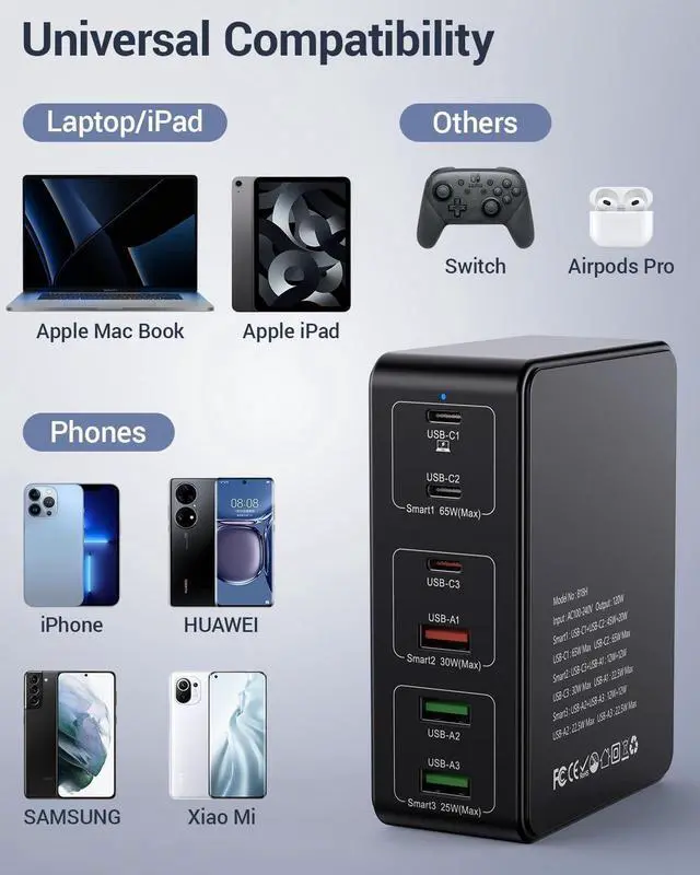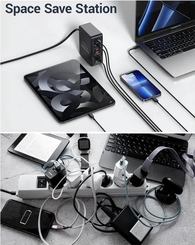Fast Charging Station: Multi port usb charge station with usb c ports(USB-C1 / USB-C2) is up to 65W for laptops, USB-C3 is up to 30W max when used single, QC 3.0 is up to 18W max. 6 ports usb charging station compatible with a wide range of devices. More up to 3× faster than with an original old.