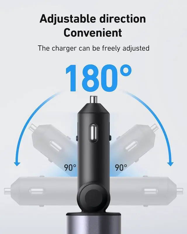 Matching Multiple Vehicle ModelsThis car charger has wide compatibility and is suitable for various vehicle models (mainstream 12V-24V vehicles). The charging plug can be adjusted 180 degrees left and right. Convenient to use, and the plug is sturdy, with a safe plug-in that will not pop up even when driving on bumpy roads.
