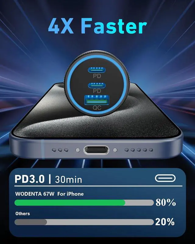 Super Fast Charging: With all-new upgrade 67W USB C car charger can fast charge your iPhone 16/15/14 up to 80% and iPad up to 60% at 30 minutes. Type c car charger adapter also fast charge for Samsung S24/S23/S22 up to 60% in just 20 minutes, 4X faster than standard car charger