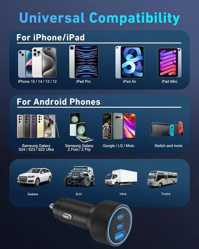 Universal Compatibility: 67W USB C car charger fast charging for iPhone 16/16e/15/14/13/12/11 Pro Max, XS/XR/X/8/7/6 Plus, iPad Pro/Air/Mini, Samsung Galaxy S25/S24/S23/S22/S21/Ultra/FE/S20/S10/S9 Plus, Note 20/10, A55/A53/A71/A73, Google Pixel 9/8/7/6/Pro/5/4XL, Moto, Tablet, Android Phones and more