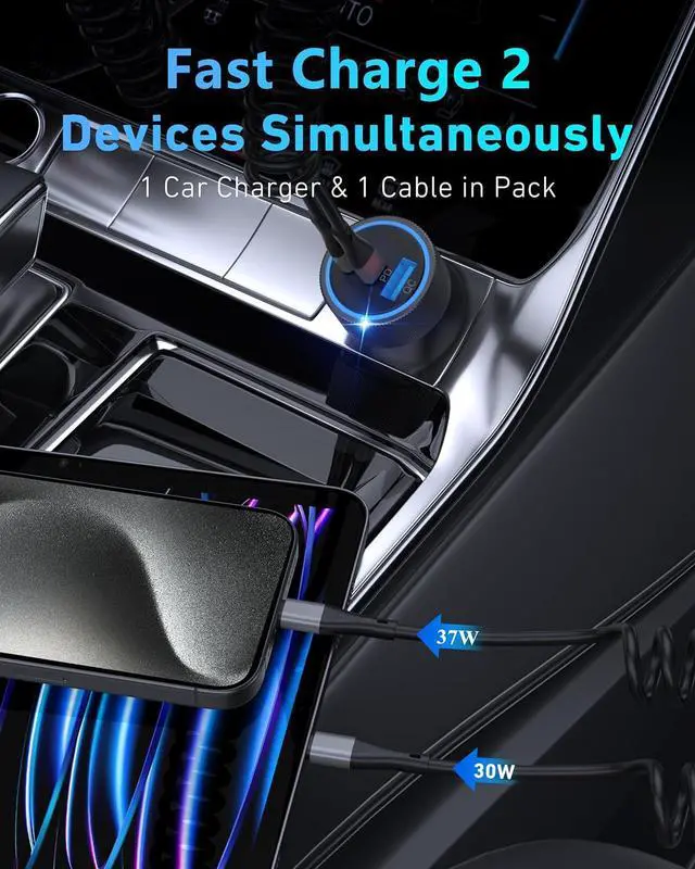 3-Port Simultaneous Charging: Car charger cigarette lighter equipped with two USB-C ports and one USB-A port, it can charge up to 3 devices simultaneous, with a total output of 67W. The multiport USB C car phone charger supports PD 37W (Max) and QC 30W (Max) high output, can fast charge all prevailing phones and electronic devices