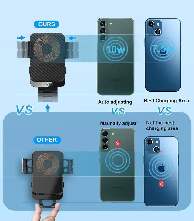 Fast Wireless Car ChargerBuit-in upgraded chip, MOKPR wireless car charger mount intelligently identify and charges your device in safe. 15W Wireless Fast Charging for LG V50/V40/V30/G8/G7; 10W for Samsung Galaxy S23 Ultra/S23+/S23/S22 Ultra/S22/S21/S20+/S20/Note 10; 7.5W for iPhone 16/15/14/14 plus/14 pro/14 pro max/13/13 Pro/12 Pro Max/12 Pro/12/11/X/XR/8;