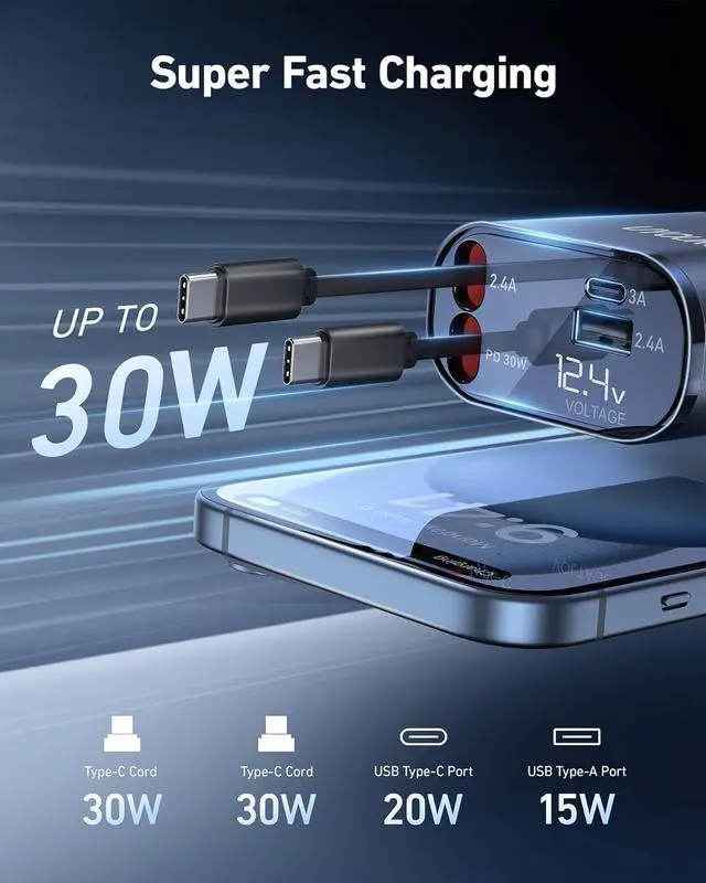 Adjustable Length Retractable Cable DesignThe car charger is equipped with 2 retractable usb c cables, their maximum stretching length is 31.5 inches. Stretch to the required length and then release to start charging. After charging, continue stretching for a short distance and then release to automatically bounce back to its original position, keeping the car clean and tidy, effectively avoiding cable entanglement and confusion, making it easy to use and store.