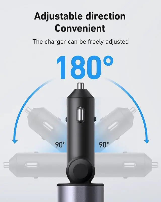 Matching Multiple Vehicle ModelsThe car charger has wide compatibility and is suitable for various vehicle models (mainstream 12V-24V vehicles). The charging plug can be adjusted 180 degrees left and right. Convenient to use, and the plug is sturdy, with a safe plug-in that will not pop up even when driving on bumpy roads.