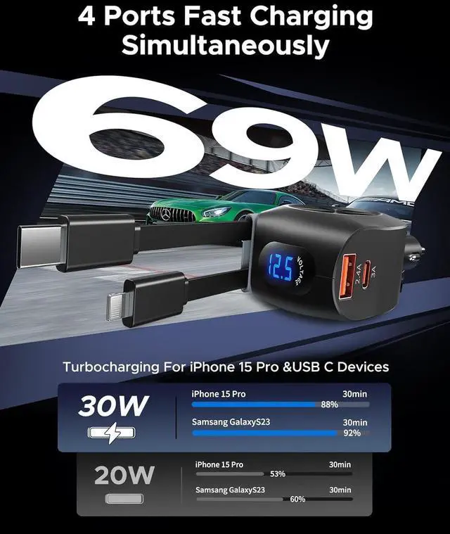 69W Fast Retractable Car Charger & PD 3.0 The KOOPAO car charger real PD30W type-C retractable cable, an IOS retractable cable, and additional USB-C and USB-A ports, this fast charge retractable car charger supports fast charging for up to 4 devices simultaneously. Say goodbye to the hassle of carrying multiple chargers for your different devices.