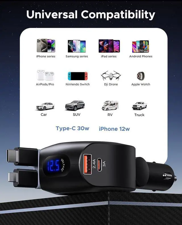 Voltage Display for Battery Health MonitoringOur Car Charger with cord is equipped with a voltage display feature, allowing you to monitor the health of your car battery at all times. Stay informed and ensure optimal performance for your vehicle. retractable car charger is applicable to mainstream 12V-24V cars with a secure plug-in, and wont pop out even when driving through bumpy roads.