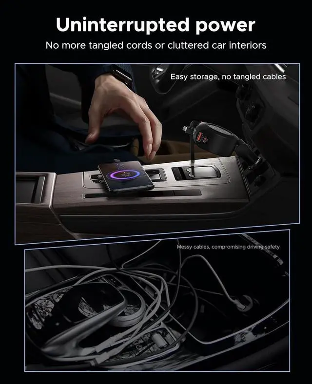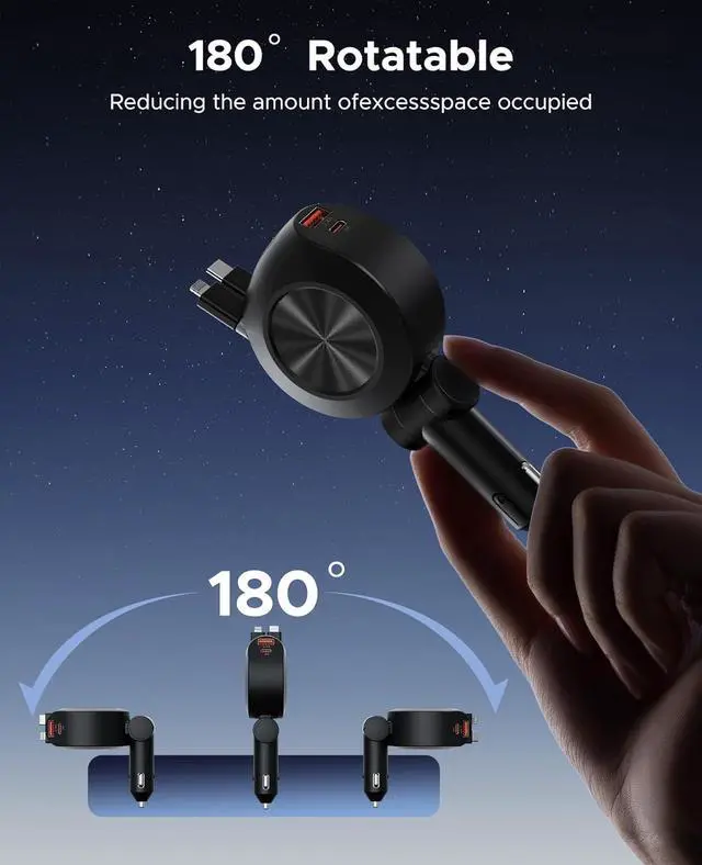 Fully Retractable Charging CablesCar phone charger equipped with two retractable charging cables, each extending up to 2.6FT / 31.5 inch, Retractable car charger ensures convenient access for passengers in the back seat, eliminating cable clutter and the inconvenience of forgetting charging cable