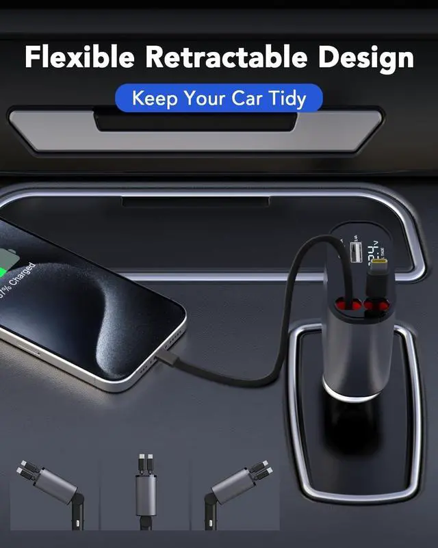 [Flexible Retractable Design] The retractable car charger pulls out the cable within the 80cm range, and it retracts back inside automatically for storage, keeping it clean and tidy without cable entanglement, and facilitating convenient control and usage