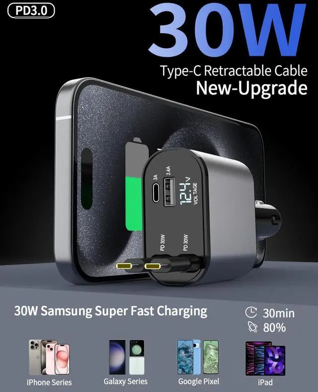 [Suitable for Various Vehicle Models] Car cell phone charger offers broad compatibility fitting various vehicle models and the retractable car charger applies to mainstream 12V-24V cars with a secure plug-in, and wont pop out even when driving through bumpy roads