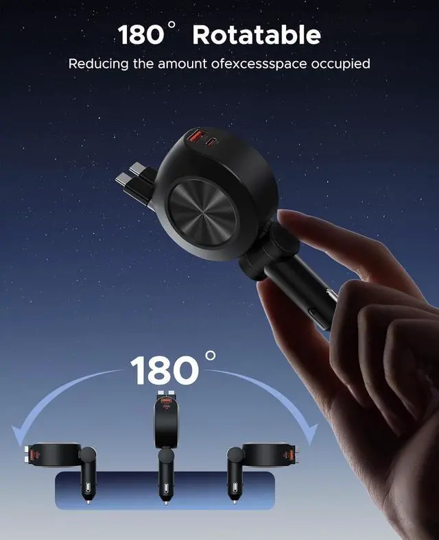 Fully Retractable Charging CablesCar phone charger equipped with two retractable charging cables, each extending up to 2.6FT / 31.5 inch, Retractable car charger ensures convenient access for passengers in the back seat, eliminating cable clutter and the inconvenience of forgetting charging cable