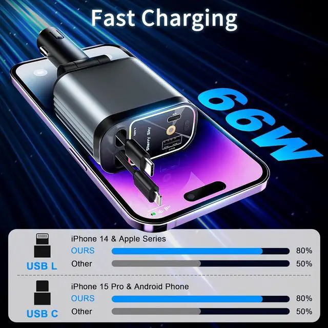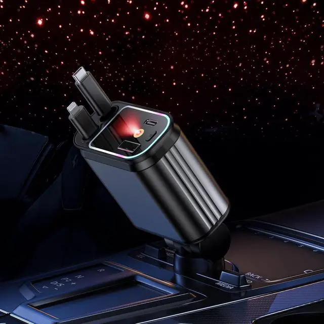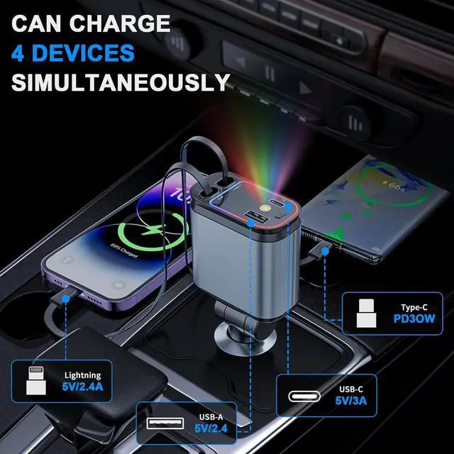 66W Fast Retractable Car Charger The fast car charger with double type-C retractable cables, and additional USB-C and USB-A ports, this fast charge retractable car charger supports fast charging for up to 4 devices simultaneously. Say goodbye to the hassle of carrying multiple chargers for your different devices.