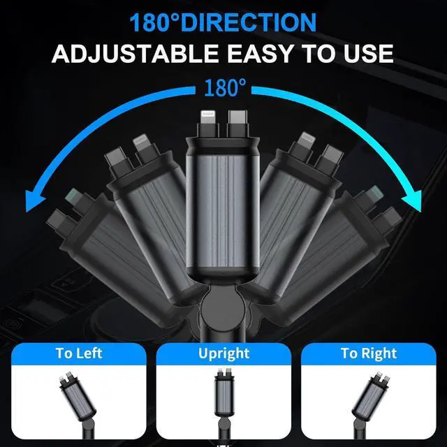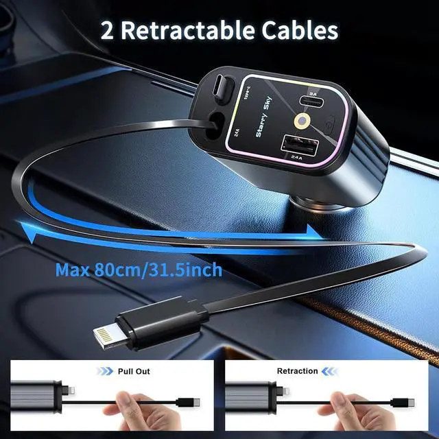 Fully Retractable Charging CablesCar phone charger equipped with two retractable charging cables, each extending up to 2.6FT / 31.5 inch, Retractable car charger ensures convenient access for passengers in the back seat, eliminating cable clutter and the inconvenience of forgetting charging cable