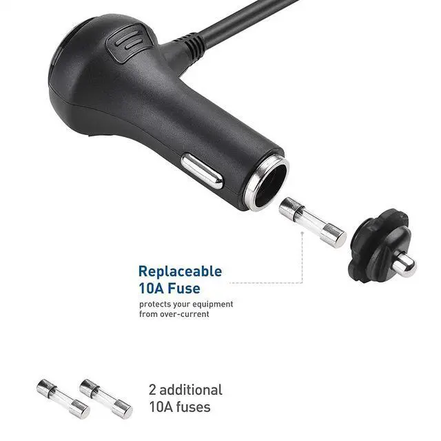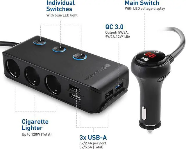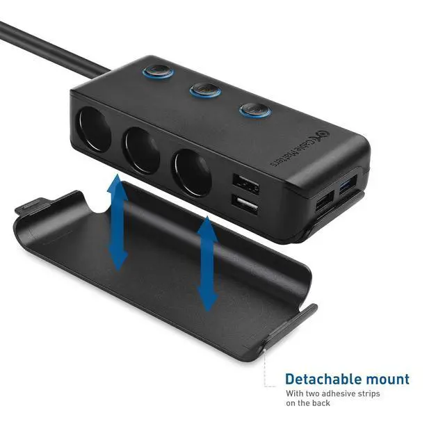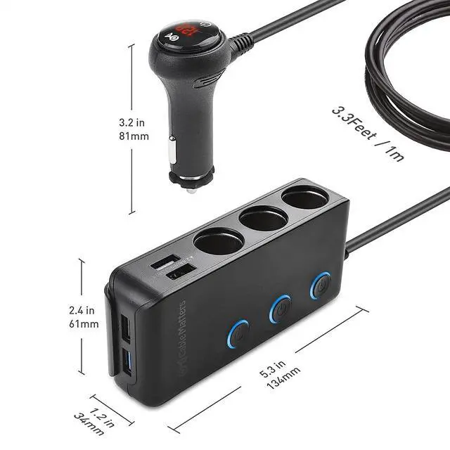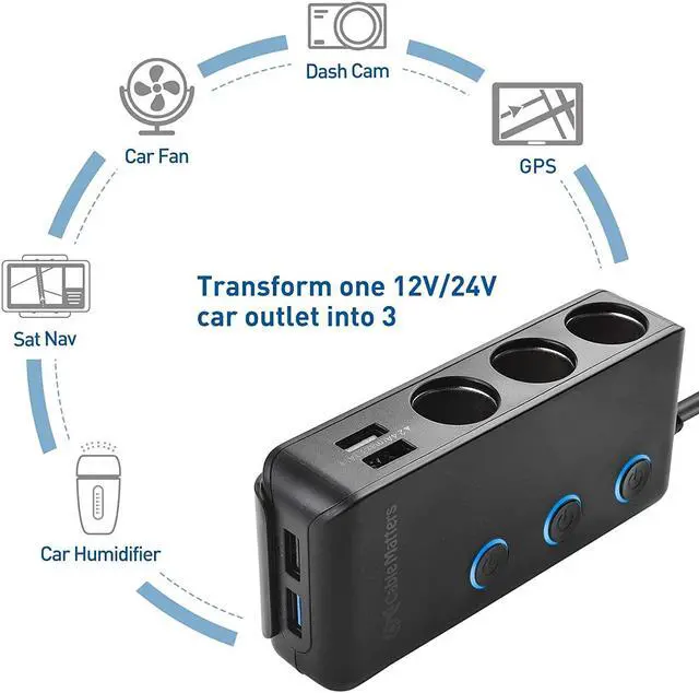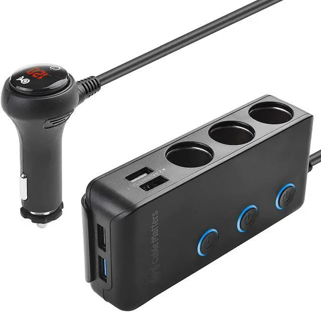 Expand your vehicles power options with the Cable Matters 3 Outlet Car Cigarette Lighter Splitter with USB Ports; Use the car cigarette splitter adapter to add 3 power ports and 4 USB charging ports to a vehicle