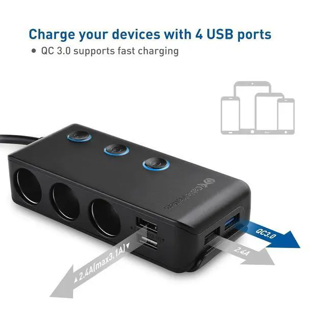 Car lighter splitter multiple ports include 4 USB ports for optimal device charging; Car USB charger supports fast charging technology on supported devices; Other ports on the car power splitter provide up to 2.4A of charging power to USB devices; Charge smartphones, tablets, cameras, and other USB devices with the 12V outlet splitter