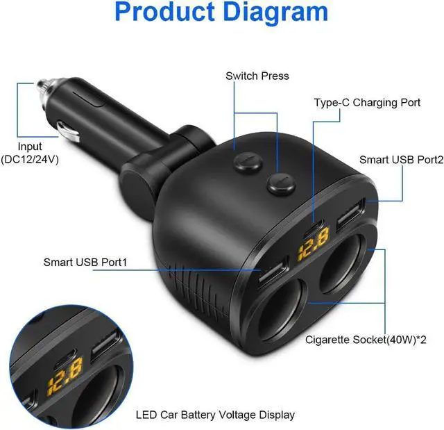 Car Splitter SecurityCigarette Lighter Socket Digital LED display will show voltage value when you charging USB devices. If voltage value is over 12V, warning with flashing, charge will be stopped. Car adapter have been certified by RoHS, CE & FCC, please feel free to use it.