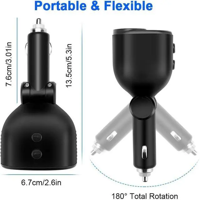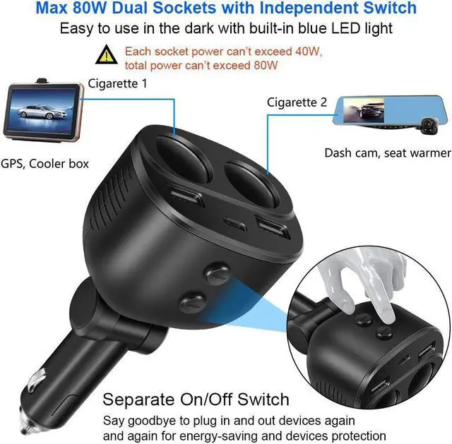 Dual USB Port & 2 Socket Cigarette Lighter2 USB charging ports with total Max 3.6A. 80W power output current enable you to charge multiple devices rapidly. 2 car cigarette lighter socket can supply power for 4 devices at the same time such as GPS, dash cam, tomtom, SatNav, seat heater, cooler box, handheld vacuum cleaner or other portable appliances in your vehicle.