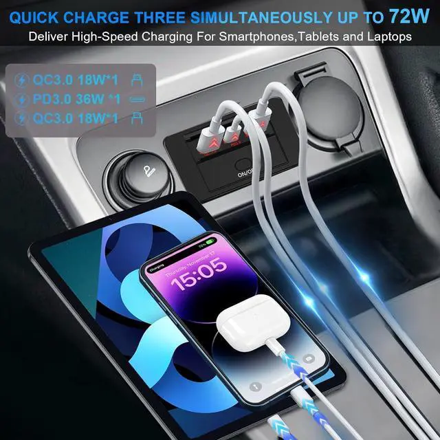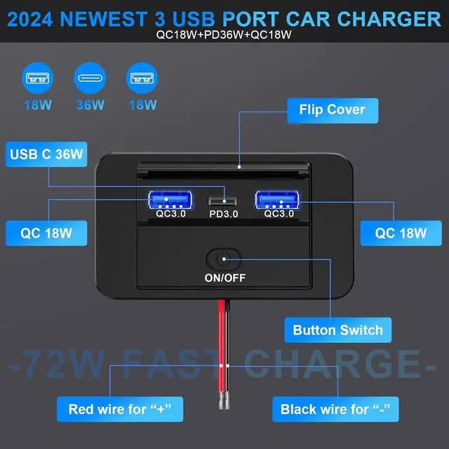 72W 3 PORT2*QC 3.0 36W1*PD 3.0 36WThe 3 port 12V usb outlet features two USB-A QC 3.0 port and a USB-C PD 3.0 port, USB-C