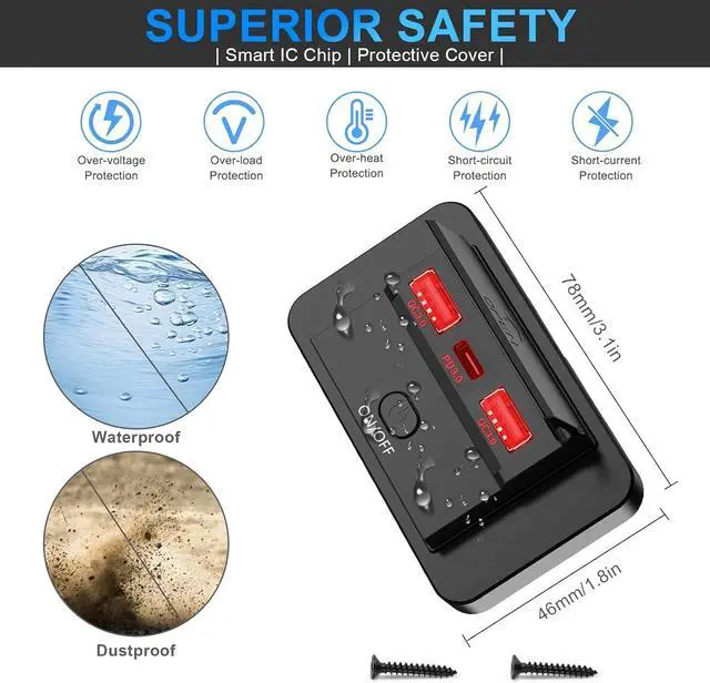 SECURITY CHARGING The three 12v usb charging port is not only high-quality ABS materials, but also equipped with upgraded smart IC chip, effectively protects your device from over-voltage, over-heating, over-load, or short-circuit.