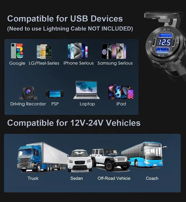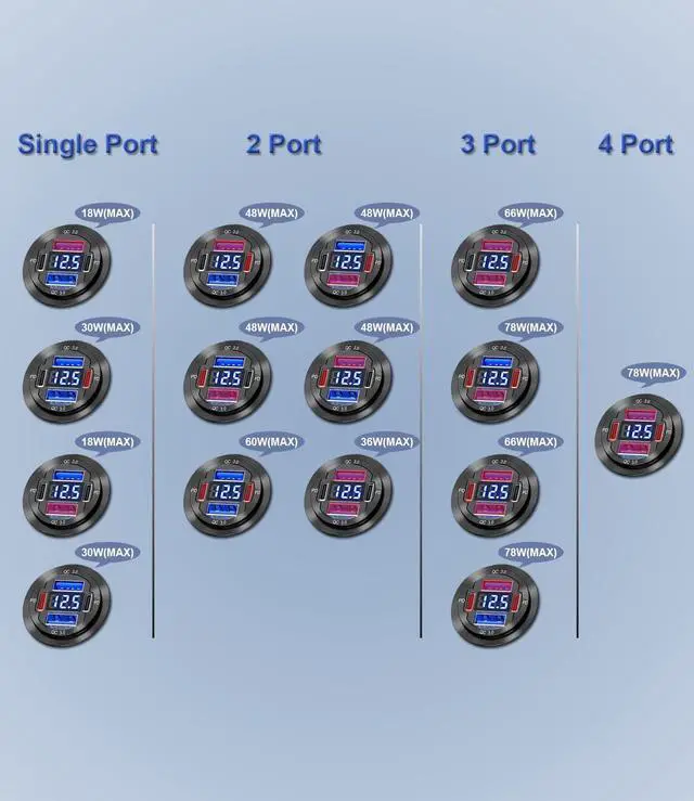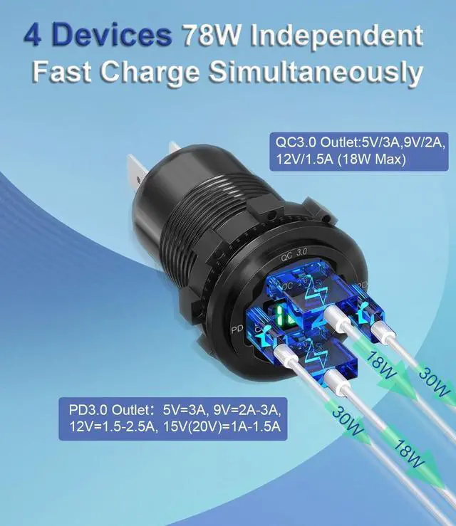 SuperCharge 4 DevicesUpgrade your vehicle's power system! This 12 volt USB charging port delivers 78W total power with dual QC 3.0 (18W) + dual PD 3.0 (60W), charging 5x faster than standard car chargers. Compatible with iPhone15/Samsung S23/iPad Pro/Google Pixel with full PD 2.0 /QC 2.0 /BC 1.2 protocol compatibility