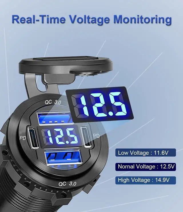 Real-Time Voltage MonitoringThis 12v usb outlet c built-in blue LED voltage meter automatically tracks 12V-24V vehicle battery health (11-16V range). Prevent roadside emergencies by monitoring electrical systems through your car usb port while charging devices