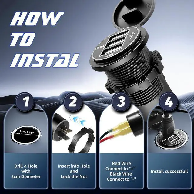 Simple Installation: Installation is quick and easyjust drill a 1.18 -inch (3cm) round hole, insert the USB charger, tighten the screw, and connect the positive and negative terminals for a hassle-free setup.