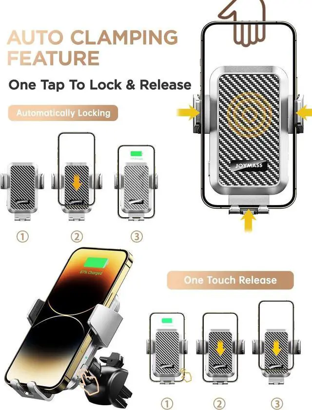 AUTO CLAMPING FEATUREJust put the phone in it, car phone holder mount wireless charging will automatically grips the phone and begins charging. Pressing either button on the side opens/closes it and as an added benefit the wireless charger for car will still open even after turning off the car