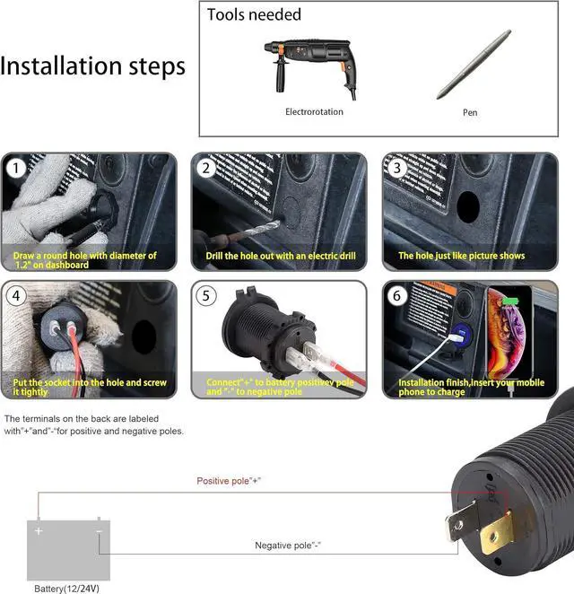Easy to mount, drill a 1.1 hole on dash, Put the socket into the hole and screw it tightly, Connect"+" to battery positive pole and "-" to negative pole, then installation finished;