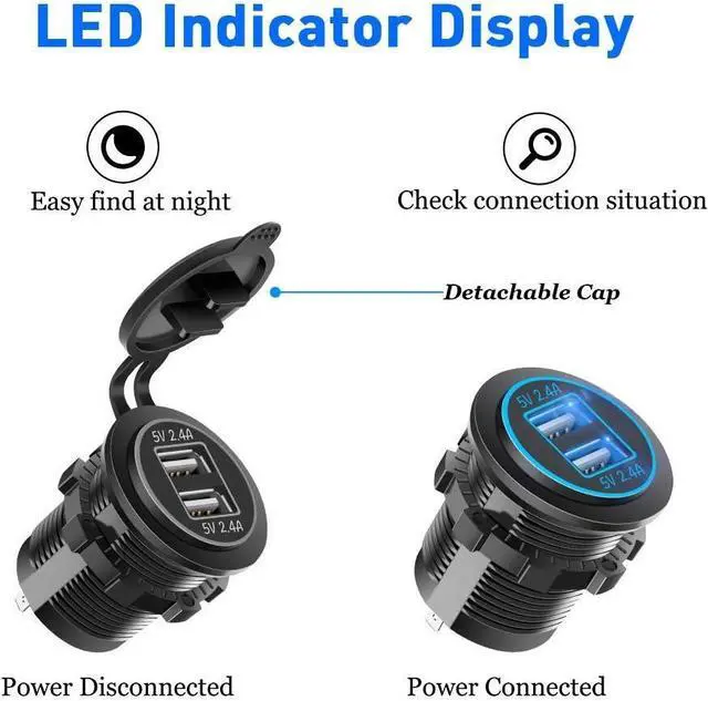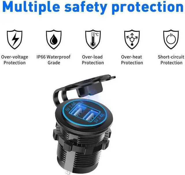 Strong Compatibility---Well fits for DC 12/24V car, boat, marine, motorcycle, ATV, RV etc. 12v USB power outlet well charging Phone 8/ 8 Plus/ X/ 7/ 6S, Samsung Note 9/ Galaxy S9/ S9+/ S8/ S8+/ S7, iPad, and other USB accessories.