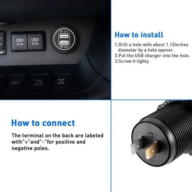 Simply Installation---Dual USB outlet is great installed within 20 minutes: "+" is plugged into positive pole and "-" is put on negative pole. It can also be connected to an on / off switch to save energy power outlet.