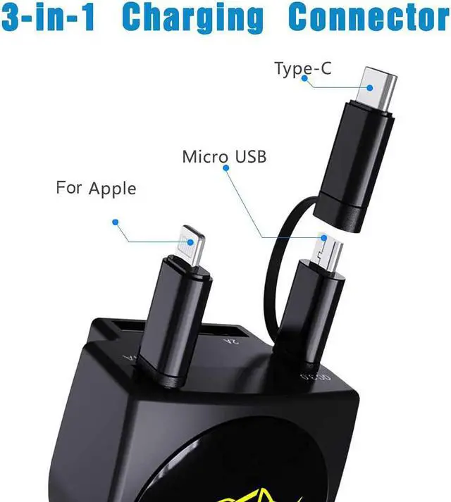 Fast ChargingRetractable cord for iPhone provides 2.4A /12W fast charging, Tpye USB-C cable provide car with fast charging tech QC 3.0, 3.0A /15W. The additional two USB ports is 2A Charging speed, faster than all ordinary 1.0A cables, you can charge devices in a short time.