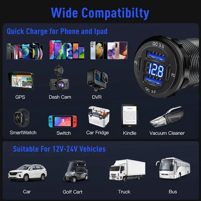 Wide Compatibility: Suitable for all DC 12/24V cars, marine, boats, bus, truck, golf cart, ATVs, RVs, motorcycles etc, and can charge all cell phones, tablets, smartwatches, dashcams, GPS, cameras, Game Consoles, GPS, Headphones, MP3 Players, Speakers, Vacuum Cleaner, etc.