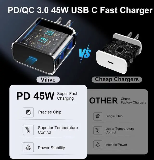Vilive Charger Fast Charging Cord charger fast charging cord with maximum power of 45 Watt Super Fast Charge capability uses Power Delivery technology to provides the most efficient charging power. Super fast charge for Galaxy S25 Ultra/S25/S24 Ultra/S24/S23 Ultra from 0% to 50% in just 20 min much higher than 15W or 25W charger. 10FT Type C Charger Fast ChargingThe Vilive 45W USB C fast charger is equipped with extra longer 10FT Type C to C cable offering a user-friendly reversible design and longer charging distance fast charging and up to 480 Mbps data transfer speed. The power output up to 5 Amp and 100-240 volt input of this 2pack charger fast charging can charge two devices simultaneously ideal for worldwide travel with your partners! 45W Fast Charger Compatibility The Vilive 45W USB C fast charger is perfect to fast charge your Galaxy S25 Ultra/S25/S25+/S24 Ultra/S24/S24+/S23 Ultra/S23/S23+/S22 Ultra S22+/S22 ultra/S22 Galaxy Z Fold 5/Galaxy Z Flip 5/Galaxy Z fold 3/ Galaxy Z Flip 3 Google Pixel xl 2/2xl 3/3xl 4/4xl 5/5xl 6/6 Pro 3a/3a xl Pixel 4a Pixel C Tab Google Chromebook Pixel.
