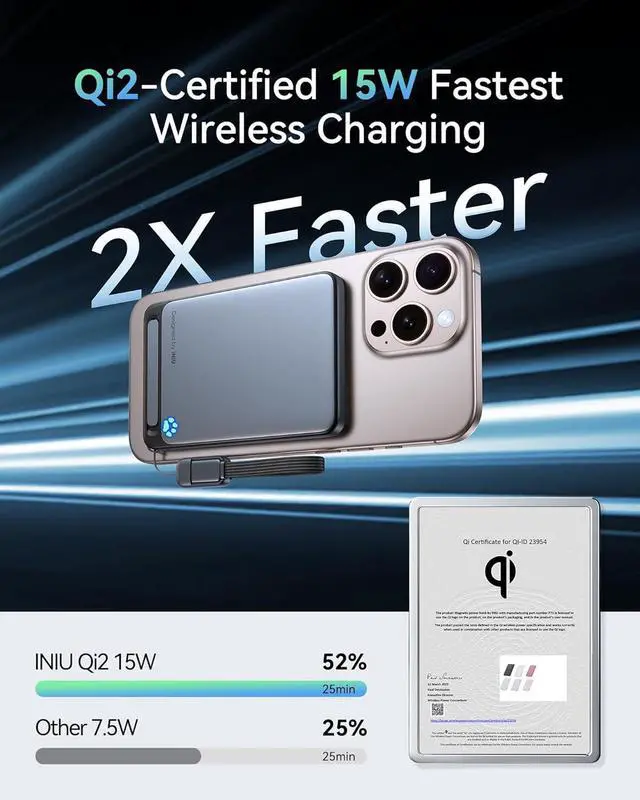 Latest Qi2-Certified 15W Wireless Charging: Solving the industry's slow wireless magnetic charging issue, this MagSafe-compatible portable charger powers your iPhone 16 from 20% to 52% in just 25min 2X faster than other 7.5W MagSafe chargers.