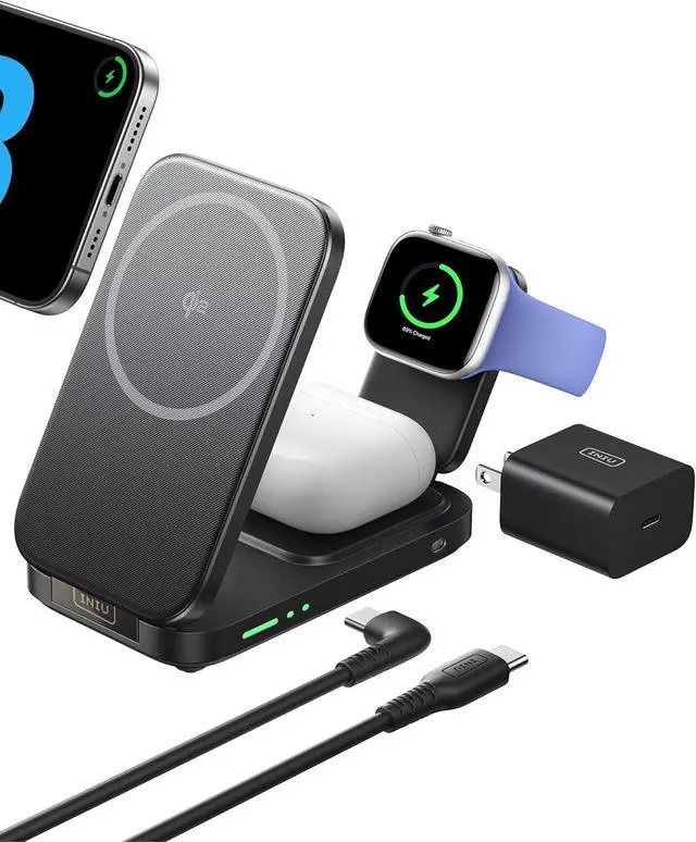 What You Get: INIU 3-in-1 wireless charger*1, 30W Adapter*1, 4.9ft USB-C to USB-C cable, user manual*1, and INIU industry-leading 3