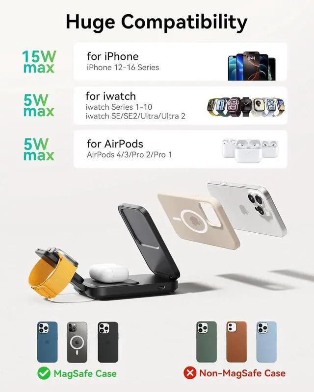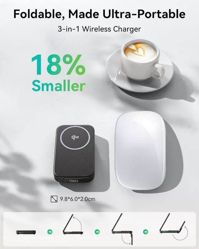 Ultra-Compact & Portable: 18% Smaller than a standard mouse at just 3.9*2.4*0.8in, this 3-in-1 foldable wireless charger fits effortlessly into your pockets or bags for true on-the-go charging convenience.