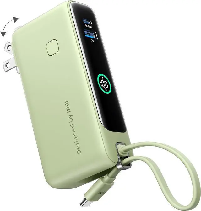 INIU 3-in-1 Portable Charger, Small 10000mah 30W Fast Charging Power Bank with Built-in USB C Cable and Foldable AC Plug, Flight Family Travel Essentials for College Students Teen Boys Girls, Green
