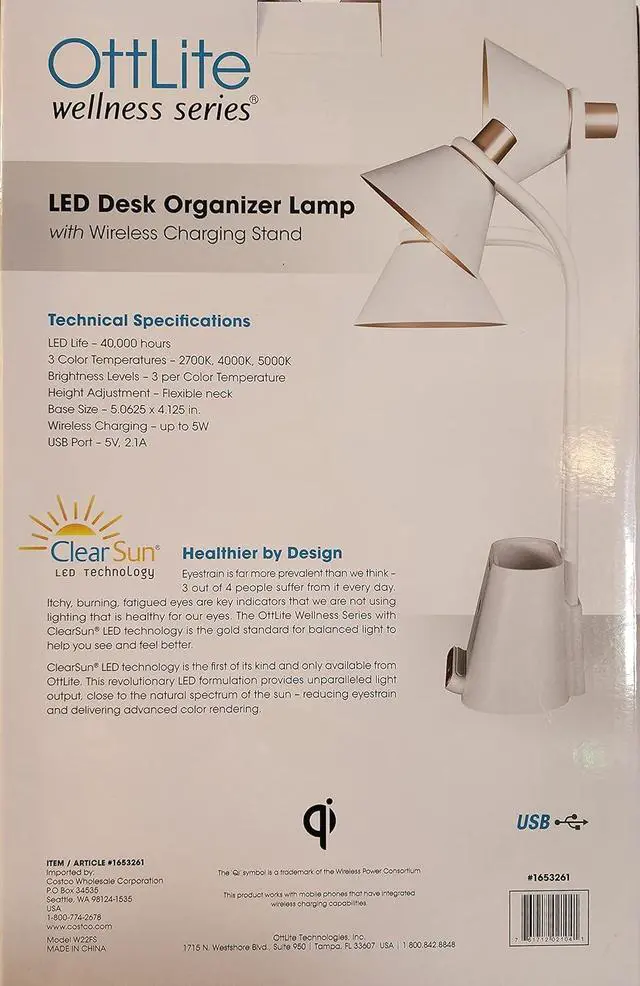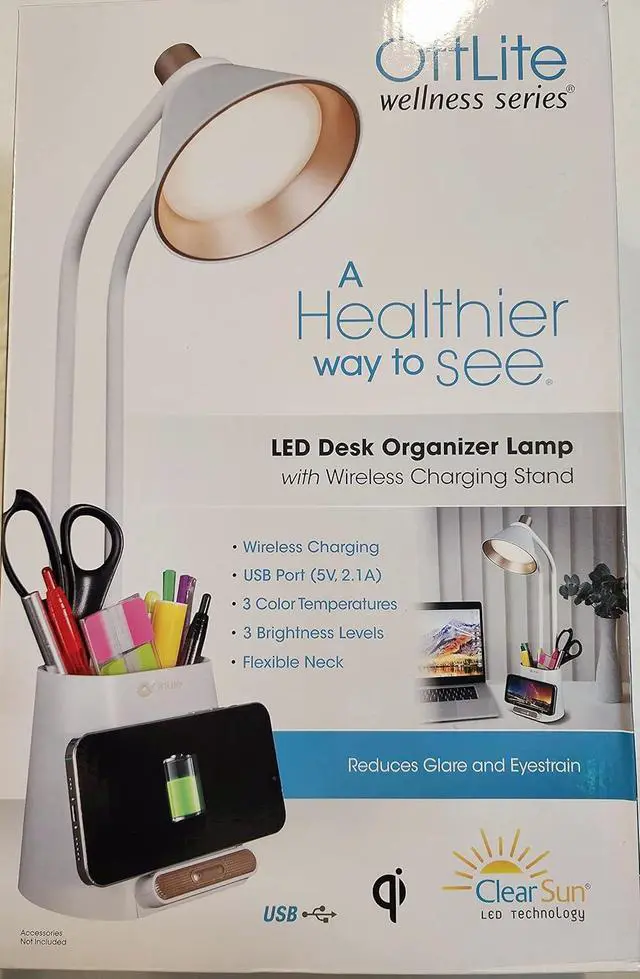 Big on style and innovation, this metal lamp with faux wood-grain accents offers two ways to charge your devices. Charge your Qi-compatible device with the powerful 10-watt charging pad or use the 5V, 2.1A USB port to fully and quickly charge phones and tablets. Providing a healthier way to see, OttLites exclusive ClearSun® LEDs reduce eye strain by 51% and provide crisp natural daylight illumination with a color rendering index of 95+. Control the three brightness settings and three color modes with the convenient touch switch. Product Features: Proprietary, exclusive OttLite ClearSun® LED reduces eye strain by 51% Provides smooth, uniform light with Color Rendering Index (CRI) of 95+ Specially designed to help you see clearly and comfortably Maximum lumen output of 450 3 color temperature modes (warm light, bright white and ClearSun® natural daylight) Includes 5V, 2.1A USB port to fully charge smartphones and tablets Base measures 6.875 inches in diameter and height adjusts from 21 to 25 inches Energy efficient LEDs rated to last up to 40,000 hours Dimensions & More Info: Metal Lamp 6.875w x 12l x 22h 5.5 Lbs 8.12 Watts Made in China Warranty: Parts/Labor: 2 years
