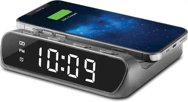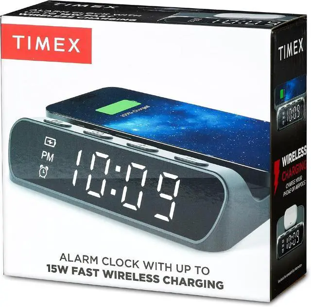 The Timex TW14 alarm clock with wireless charging has a compact, space-saving design that will complement any bedroom or office decor. Use the 15W wireless charging pad to power up your iPhone or AirPods while resting and recharging every night. Set an alarm to wake the buzzer and adjust the brightness of the display with the high/low dimming function. Works with USB-A to USB-C power cable. Battery backup system will maintain clock and alarm settings in case of temporary power failure (2 AAA batteries)