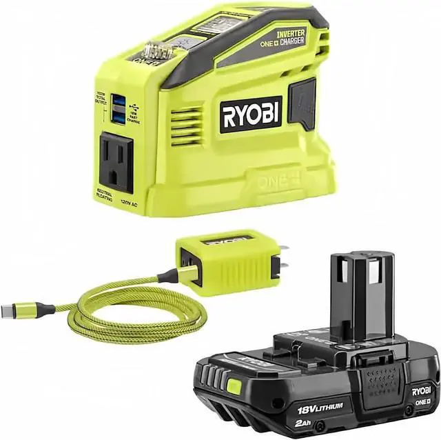 USB-C Universal Charging Allows Charging 18-Volt One+ Batteries by Household Outlet, In-Car Charging and even Solar Charging 150-Watt of Continuous Output Over 260 ONE+ Tools All Work With Any RYOBI ONE+ 18V Battery The RYOBI 18V ONE+ Power Source provides convenient, on-the-go power both on and off the jobsite. With 150-Watts of continuous output, this Power Source is perfect for powering laptops, tablets, cell phones, fans and other small electronics. The compact and lightweight design is compatible with all of your existing RYOBI 18V ONE+ batteries making endless power even easier. This RYOBI Power Source also acts as a charger, allowing you to recharge your ONE+ batteries through the USB-C port. Equipped with (1) 120-Volt outlet, (2) Fast Charging USB-A outlets and (1) Fast Charging USB-C outlet, your compatible small devices will charge as fast as possible, up to 30 Watts. This kit includes our new USB Fast Charging Wall Adaptor & USB charging cable, making your options of where and how to charge your batteries more versatile than ever. This Power Source kit also comes with a 2.0 Ah battery that is compatible with over 225 RYOBI 18V ONE+ products. This tool is backed by a 3-Year Limited Warranty.