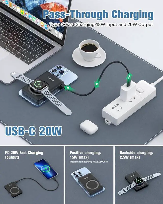 Fast Wireless & Wired Charging: Support 5W, 7.5W, 10W and 15W Max wireless charging and max 20W USB-C output; support max 12W Lighting input and max 18w USB-C input; The wireless charger can charge 2 Devices at the same time, shared charging with no waiting. And the portable charger uses soft silicone material to protect your phone from damage while wireless charging