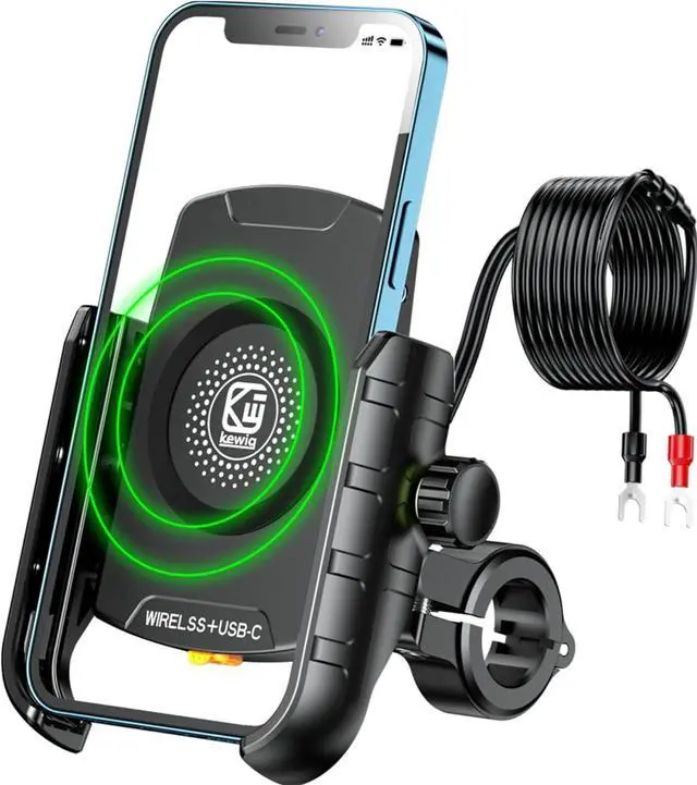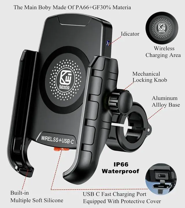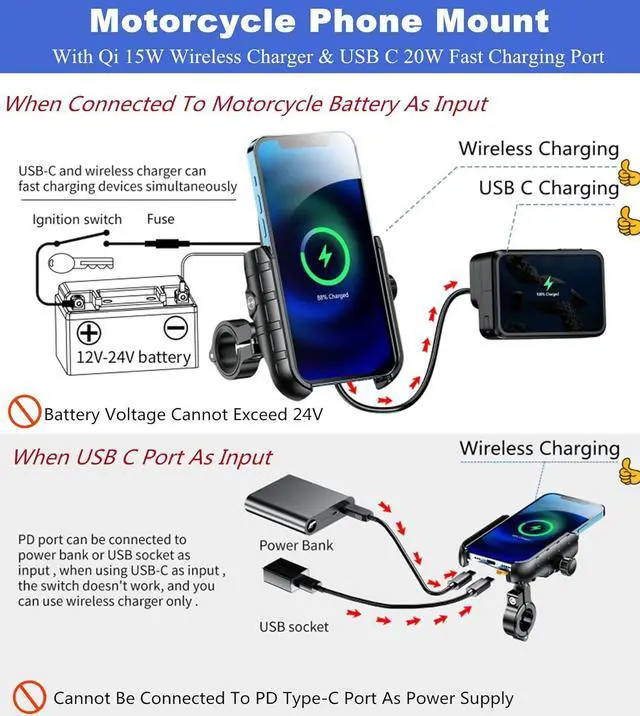 Motorcycle phone mount with wireless charger and PD charging port Motorcycle phone holder USB C port as input: Motorcycle cell phone mount with aluminum alloy handlebar mounting base Parameter details