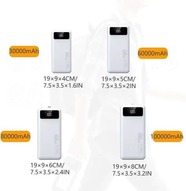 - Product size: 19×9×5cm/7,5×3.5×2inch(60000Mah), 19×9×6cm/7,5×3.5×2.4inch(80000Mah), 19×9×8cm/7,5×3.5×3.2inch(80000Mah).