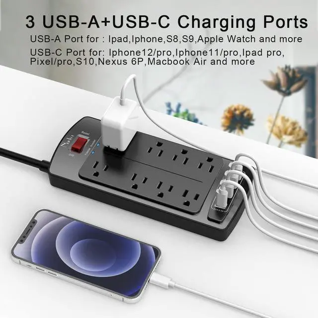 Power Bar with 8AC outlets & 4 USB- power bars with surge protector with 8AC outlets & 4 USB charging ports (1 USB C Outlet), 6 Feet Heavy Duty extension cord(1625W/13A), surge protector (2700 Joules) with overload protection protects against spikes and fluctuations.